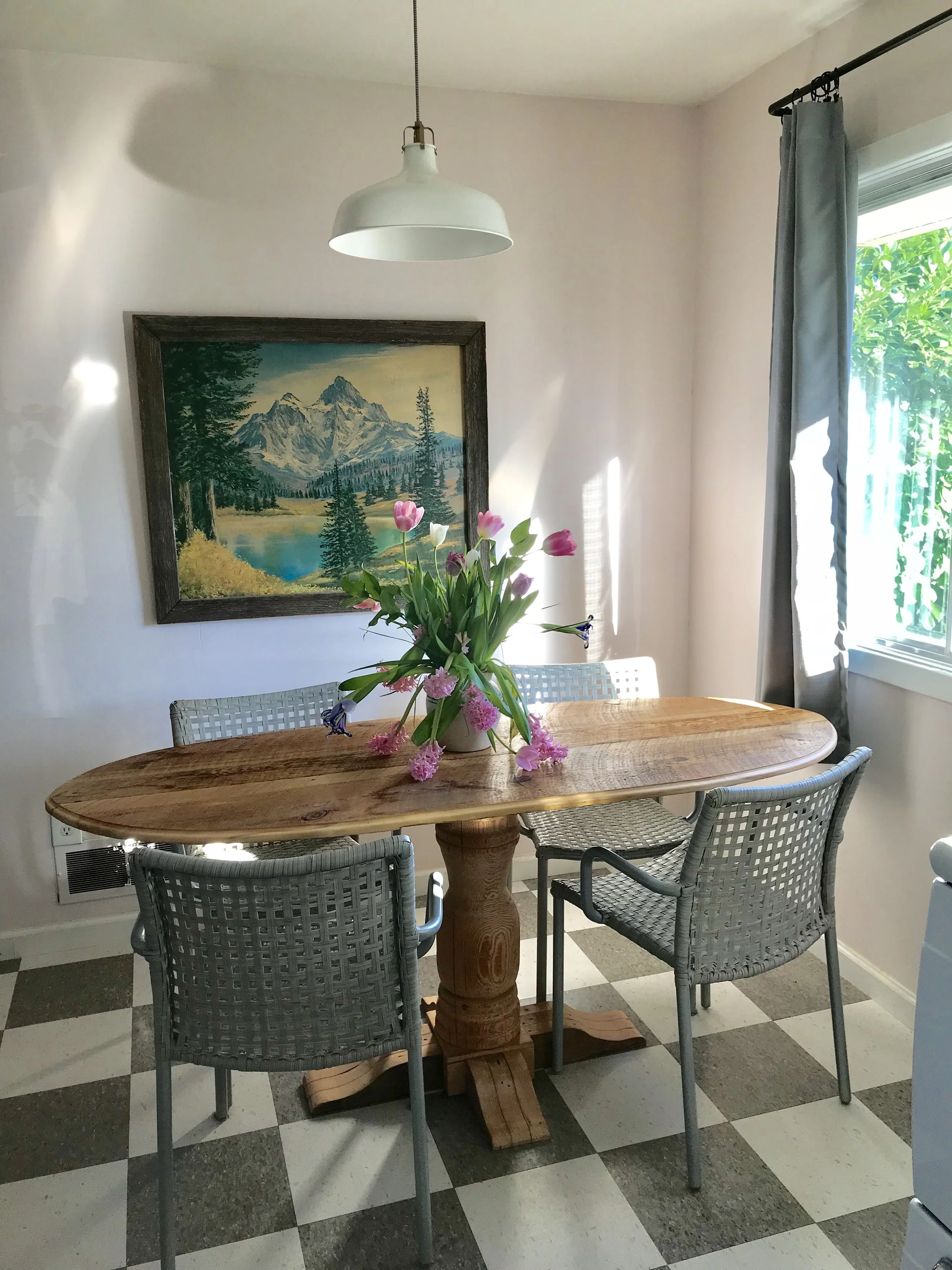Honoring a home’s history has always been important to us, and even with this little cookie-cutter house, we wanted to preserve its original spirit. Rather than turn the home into a series of add-ons to increase square footage, we looked for cost-efficient design opportunities to bring more connection, charm, and light to the existing cozy yet compartmentalized layout. We exchanged aluminum windows for wood, added skylights, painted the interior a warm white, and grounded the space with reclaimed and natural wood elements for a Scandinavian-inspired cottage. One of the most significant changes we eventually made in 2020 was converting a bedroom adjacent to the living room into a dining room, accessible by a new cased opening. This not only gave us a much-needed place to gather, but also brought us closer to the outdoors.